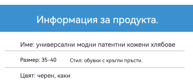 | Продукт | SKU | Описание | Колекция | Наличност | Тип продукт | Други подробности |
