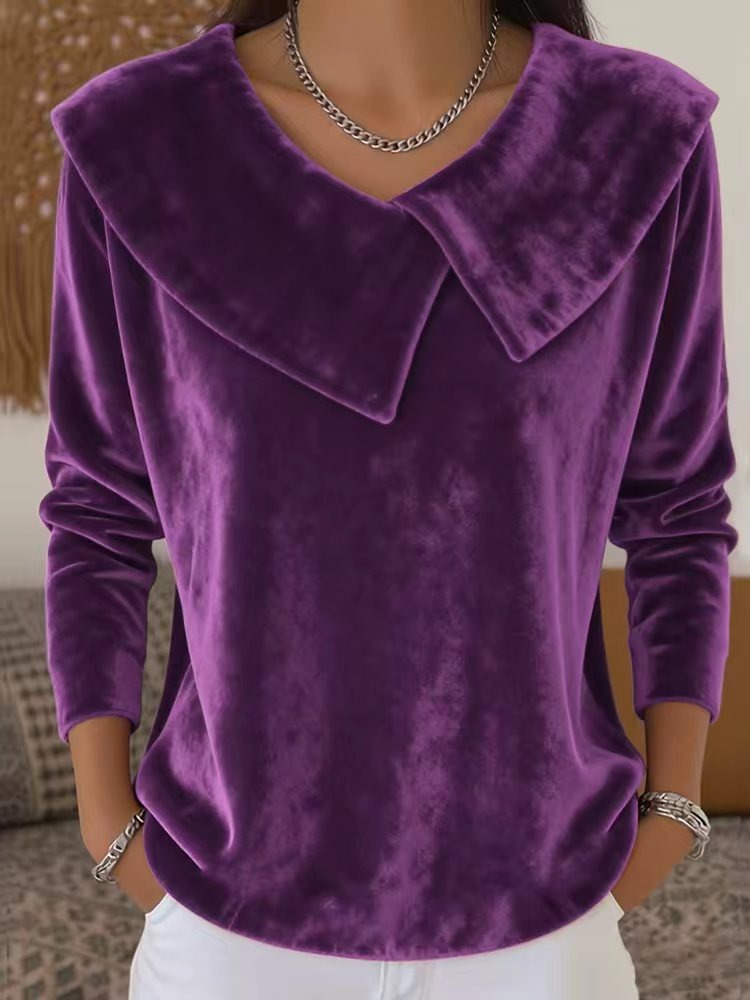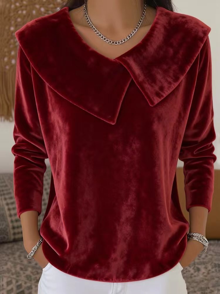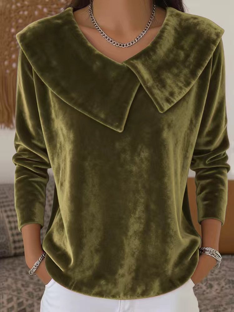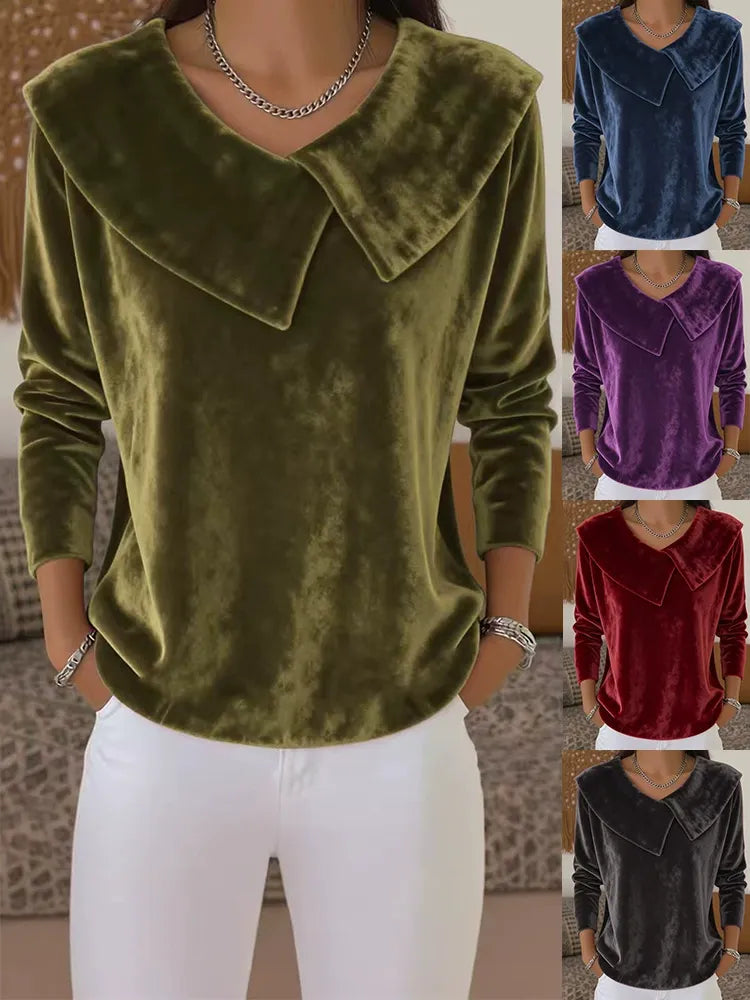 Кадифена Блуза с Дълъг Ръкав в Един Цвят